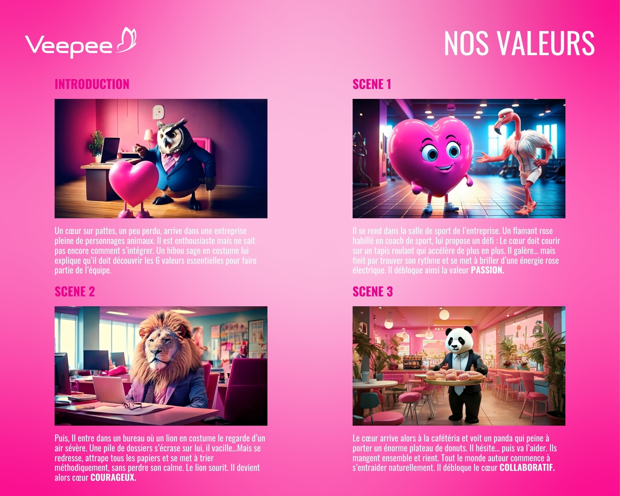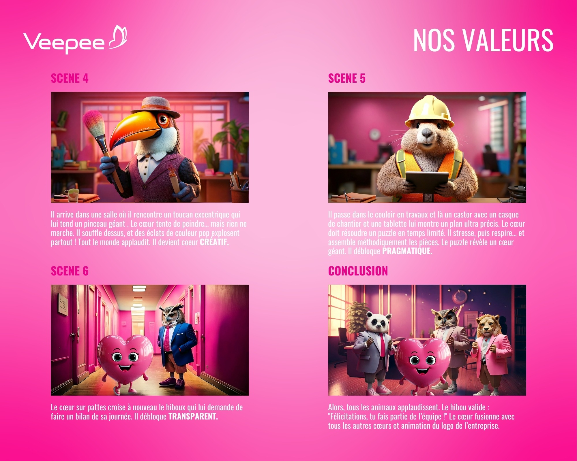 • Traduire des concepts abstraits (passion, courage, collaboration, créativité, pragmatisme, transparence) en situations visuelles concrètes