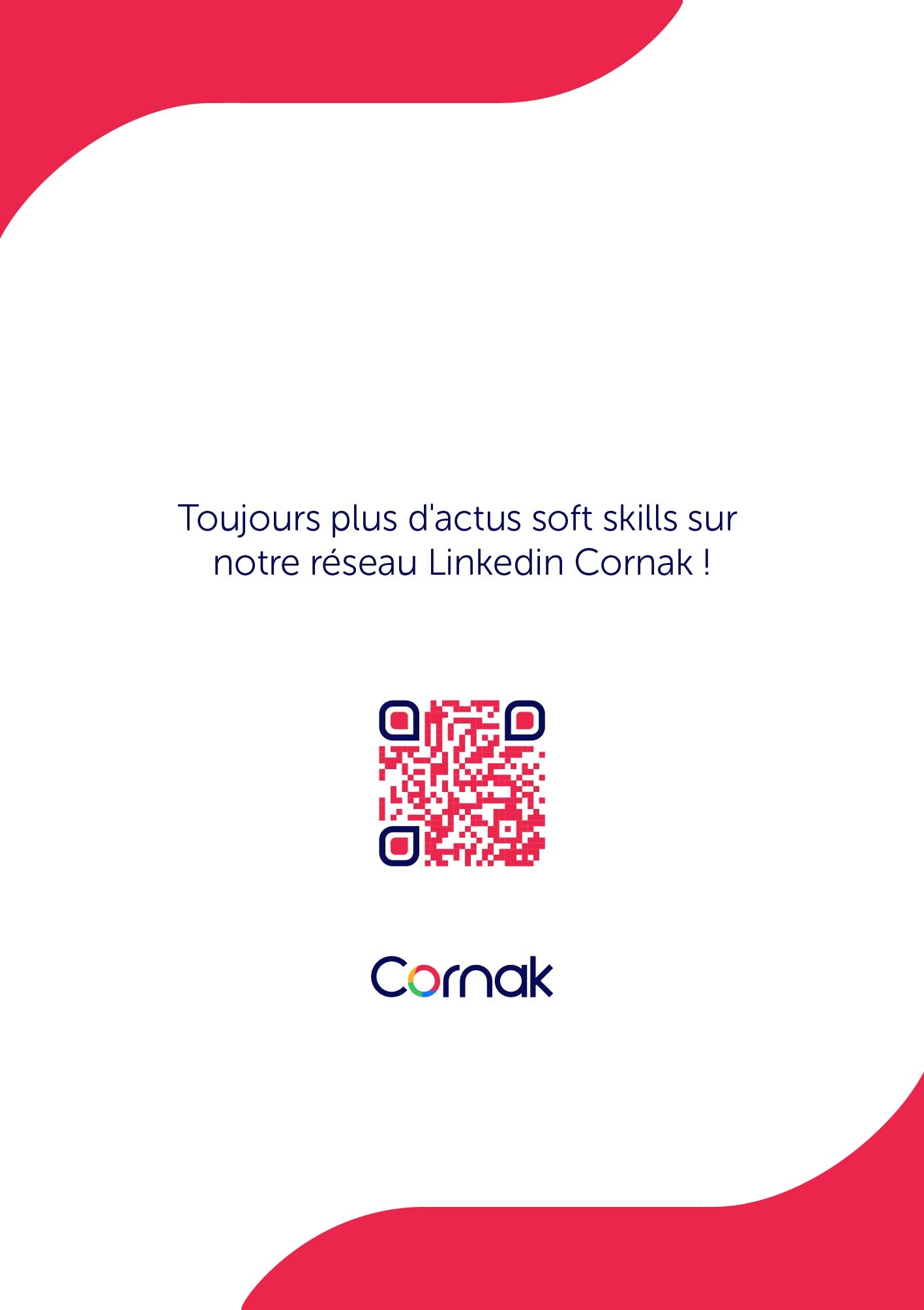 Format triptyque : équilibre entre texte inspirant, graphisme et QR code vers le réseau LinkedIn de Cornak.