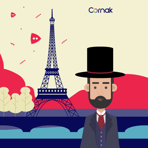 Illustration originale de Gustave Eiffel façon personnage cartoon, réutilisable dans d’autres supports.